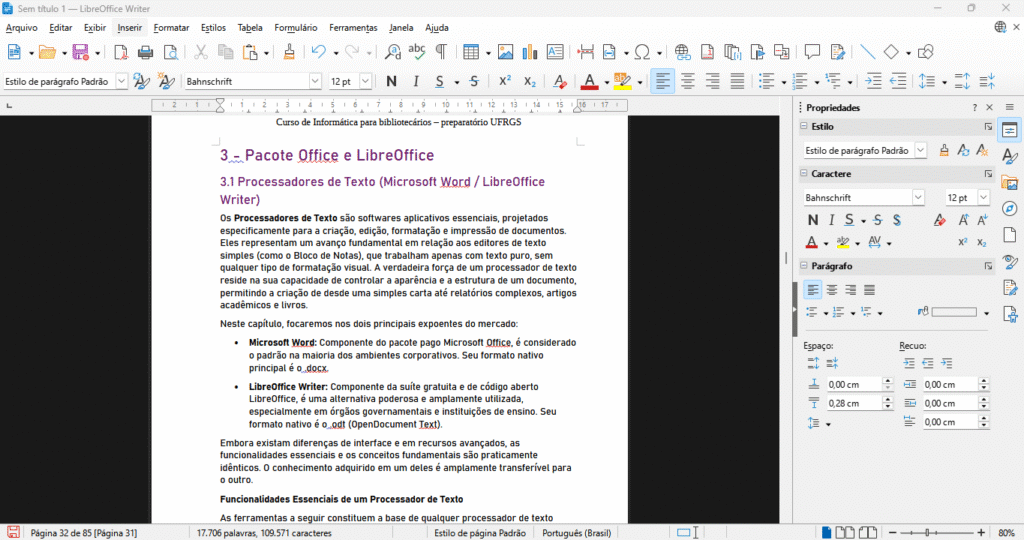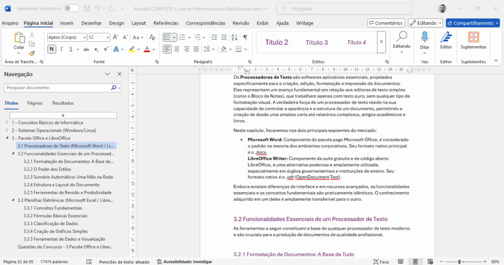- LibreOffice Writer: Componente da suíte gratuita e de código aberto LibreOffice, é uma alternativa poderosa e amplamente utilizada, especialmente em órgãos governamentais e instituições de ensino. Seu formato nativo é o .odt (OpenDocument Text).